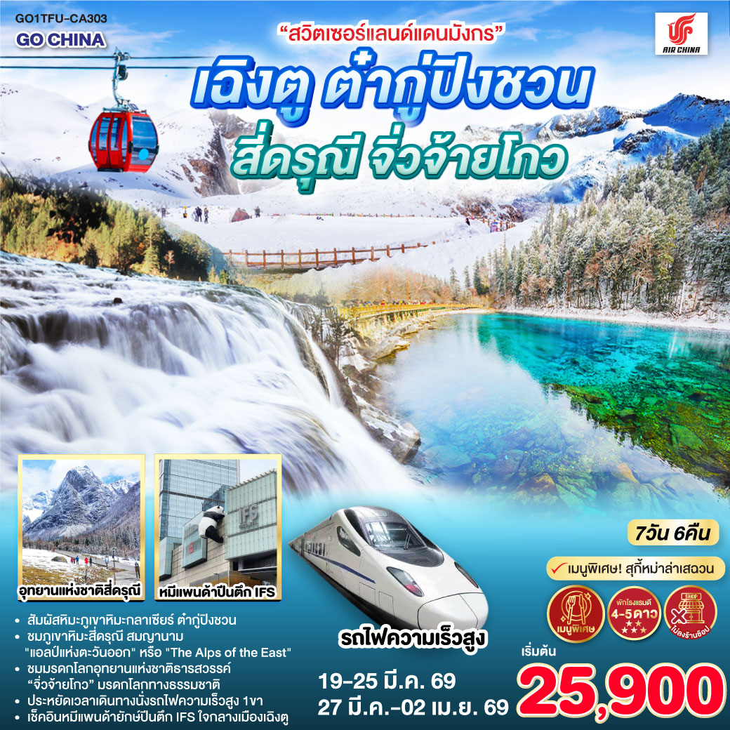 “สวิตเซอร์แลนด์แดนมังกร” เฉิงตู ต๋ากู่ปิงชวน สี่ดรุณี จิ่วจ้ายโกว 7วัน 6คืน *ไม่ลงร้านช้อป* โดยสายการบิน Air China (CA)