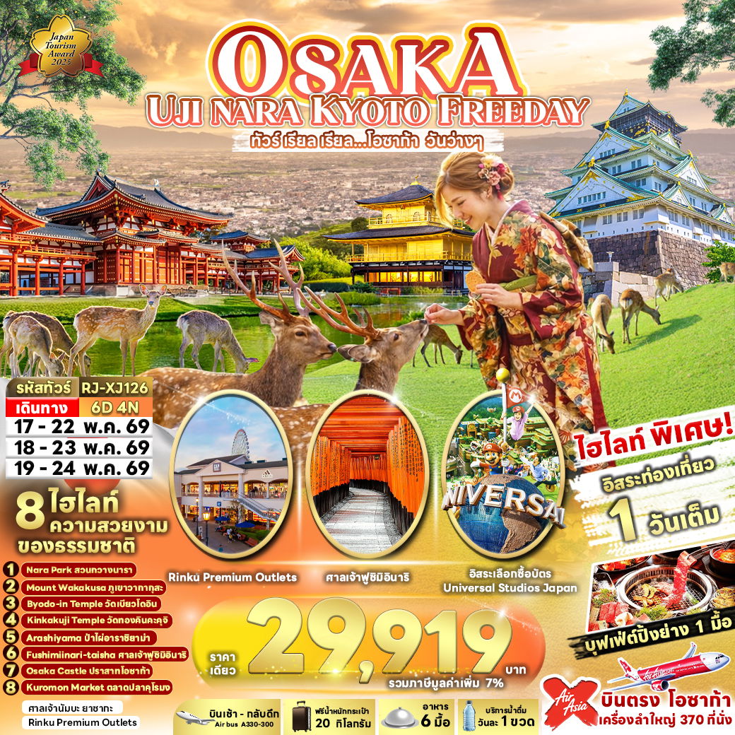 เมืองโอซาก้า เมืองนารา วัดโทไดจิ สวนกวางนารา MT WAKAKUSA REST SHELTER จังหวัดเกียวโต เมืองอุจิ วัดเบียวโดอิน เมืองโอซาก้า เมืองเกียวโต วัดทองคินคะคุจิ เรียบรู้พิธีชงชาญี่ปุ่น ศาลเจ้าฟูชิมิอินาริ ป่าไผ่อาราชิยาม่า เมืองโอซาก้า อิสระท่องเที่ยวเต็มวัน ไม่มีรถบัสให้บริการ ปราสาทโอซาก้า ด้านนอก ศาลเจ้านัมบะ ยาซากะ ตลาดปลาคุโรมง RINKU PREMIUM OUTLETS