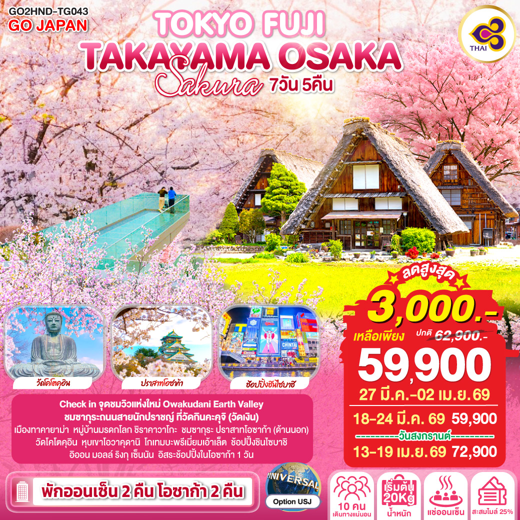 ไฮไลท์ทัวร์-Highlight Check in จุดชมวิวแห่งใหม่ Owakudani Earth Valley – ชมซากุระถนนสายนักปราชญ์ ที่วัดกินคะคุจิ (วัดเงิน) – เมืองทาคายาม่า – หมู่บ้านมรดกโลก ชิราคาวาโกะ – ชมซากุระ ปราสาทโอซาก้า (ด้านนอก) – วัดโคโตคุอิน – หุบเขาโอวาคุดานิ – โกเทมบะพรีเมี่ยมเอ้าเล็ต – ช้อปปิ้งชินไซบาชิ – อิออน มอลล์ ริงกุ เซ็นนัน – อิสระช้อปปิ้งในโอซาก้า 1 วัน – พักออนเซ็น 2 คืน โอซาก้า 2 คืน